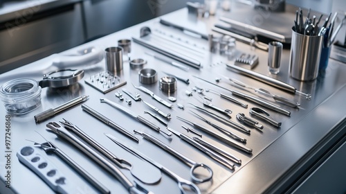 © somneuk, Fototapeta premium A close-up of high-tech medical equipment, including surgical instruments and diagnostic devices, displayed on a stainless steel table in a sterile environment.