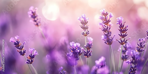 Naklejka premium A close-up of lavender flowers in soft focus, creating a serene and calming atmosphere.