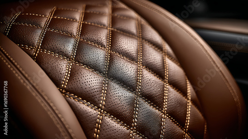 © Strother, Obraz premium A close-up of luxurious brown leather with a diamond-quilted pattern and contrast stitching. Detailed texture for automotive or furniture upholstery.