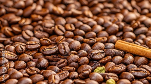 Naklejka premium A close-up of Moroccan coffee beans with spices like cinnamon and cardamom,...