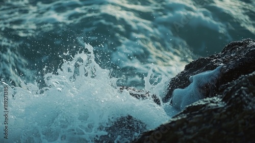 Obraz premium A close-up of ocean waves crashing against rocks, showing the power and beauty of the sea