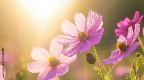 © Hafidz, Fototapeta premium A close-up of pink flowers basking in warm sunlight, creating a serene and cheerful atmosphere.