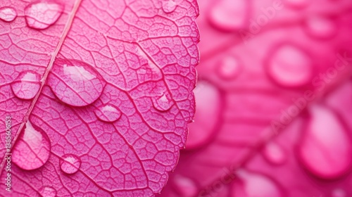 © Asayamrad, Fototapeta premium A close-up of pink leaves adorned with water droplets, showcasing intricate textures and vibrant colors.