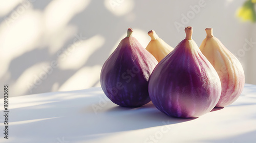 © Mariani, Fototapeta premium A close-up of purple and white figs arranged on a surface with soft lighting.