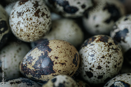Obraz premium A close-up of quail eggs with various mottled patterns and natural textures,...