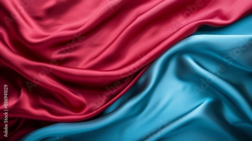 © Mikus, Fototapeta premium A close-up of red, blue, and pink silk material with diagonal patterns