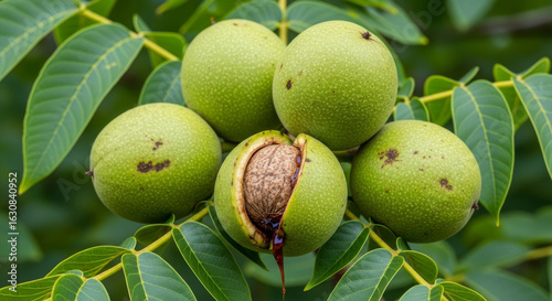 Obraz premium A close-up of ripening walnuts in their green husks on a tree, with one split...