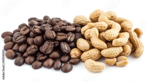 Naklejka premium A close-up of roasted coffee beans and raw peanuts, highlighting their...