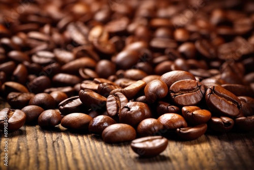 © ChaoticMind, Naklejka premium A close-up of roasted coffee beans, highlighting the rich texture and depth of color, perfect for depicting the essence of coffee