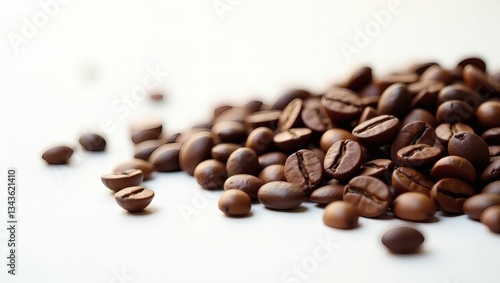 © Asawin, Naklejka premium a close-up of roasted coffee beans, showcasing their rich textures. They are scattered and piled, suggesting freshness and aroma.