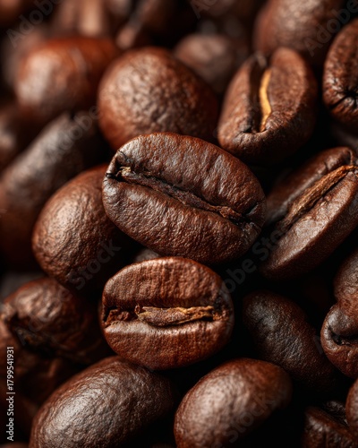 Naklejka premium A close-up of roasted coffee beans with rich dark tones and textured surfaces.