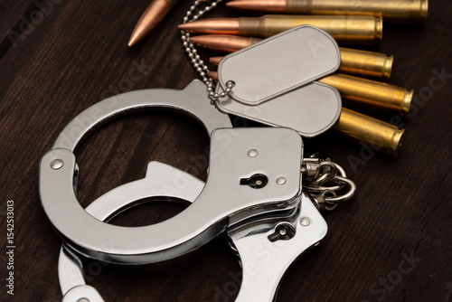 Obraz premium A close-up of shiny handcuffs, two army badges and several cartridges. The objects are lying against a background of aged wood,