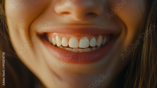 Obraz premium A close up of smiling woman showcasing her bright, healthy teeth and joyful expression. warm lighting enhances natural beauty of her smile, radiating happiness and positivity