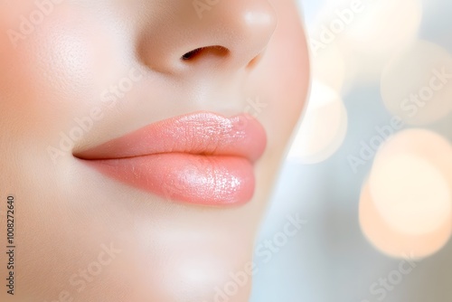 © nuiiko, Obraz premium A close-up of smooth, soft lips with a light pink sheen, set against a blurred, shimmering background that enhances the beauty.