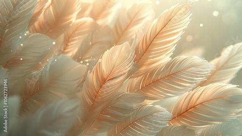 © Fridocha, Obraz premium A close-up of soft, delicate feathers with a warm, ethereal glow.
