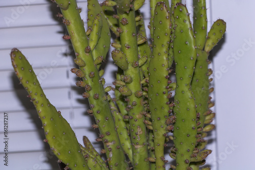 © gicku91, Naklejka premium A close-up of the long, green cactus trunk with many small dark brown spots on it
