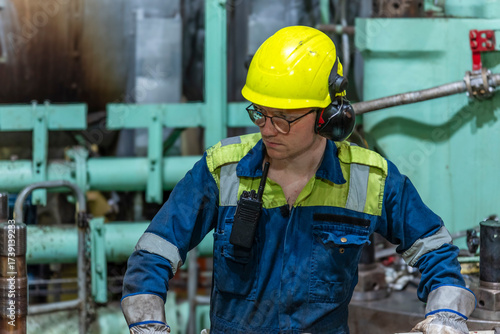 Fototapeta premium A close-up of the marine engineer officer, wearing a helmet, focused on...