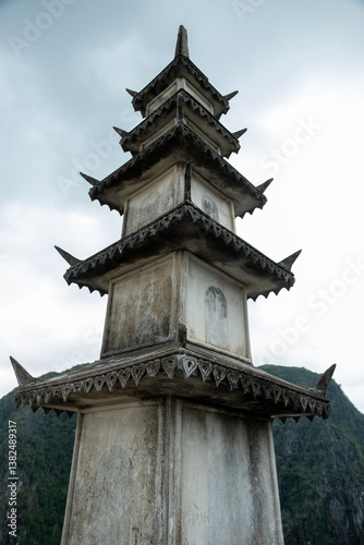 Fototapeta premium A close-up of the stone pagoda at the summit of the Mua Caves viewpoint in...