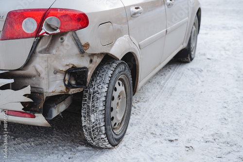 © Aleksey, Naklejka premium A close-up of the wing of the car was broken at the rear. Missing rear bumper car after an accident on the road, winter in the city.