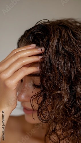 Obraz premium A close-up of the woman's hand running her fingers through her curly hair,...