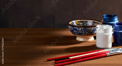 © Alexandr, Obraz premium A close-up of traditional Asian ceramic bowls and paint jars with brushes on a wooden surface