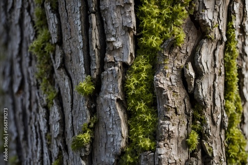 © Ravindu, Obraz premium A close up of tree bark texture with green moss growing on the surface in natural light setting outdoors