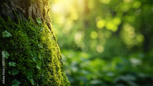 © bajita111122, Fototapeta premium A close-up of vibrant green moss covering a tree trunk, detailed texture with tiny water droplets