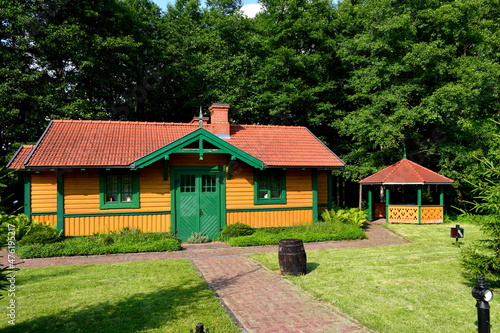 © Rafal, Fototapeta premium A close up on an old building made out of logs, planks and boards wih an angled roof made out of tiles located next to a small gazebo and a wooden barrel used for decorative purposes in Poland