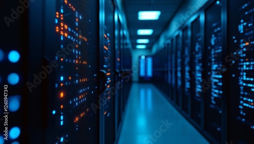 © Ada, Fototapeta premium A close-up perspective of server room racks with digital binary code highlighted by blue and orange lights.