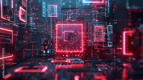 © Guyu, Fototapeta premium A close-up photo of a computer chip glowing red under neon lights. Can be used for technology, computer-related blogs and advertisements.