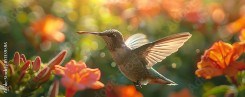 © Coosh448, Naklejka premium A close-up photo of a hummingbird hovering in front of a flower, its wings beating so fast they are almost invisible.