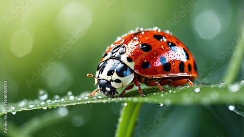 © MST, Fototapeta premium A close-up photo of a ladybug covered in water droplets on a grass blade during a rainfall