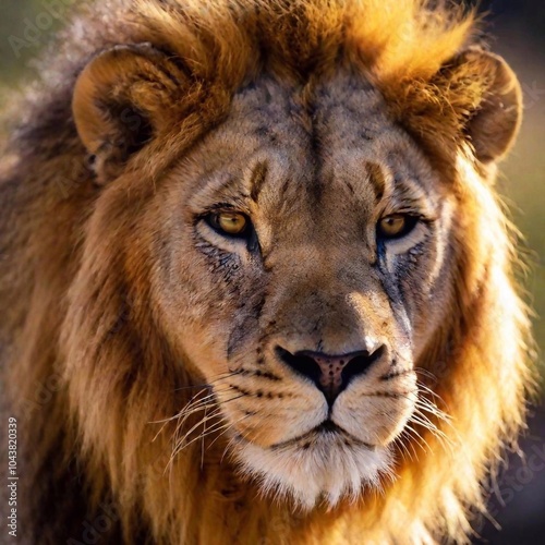 Fototapeta premium A close-up photo of a lion with sunlight catching its mane, deep focus on its...