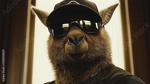 © Shanti, Fototapeta premium A close-up photo of a llama wearing sunglasses and a baseball cap on its head