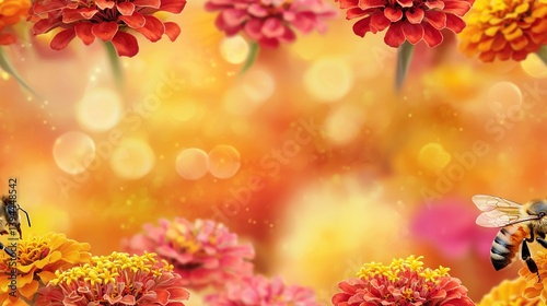 © Anna, Obraz premium A close-up photo of several flowers with a bee hovering over them, surrounded by a blurry backdrop