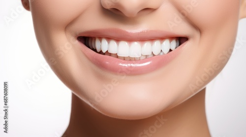 © Tirawat, Fototapeta premium A close-up photo of the lower part of a female face. Beautiful, cute smile with immaculate, perfect teeth. Chin, nose, and mouth visible.