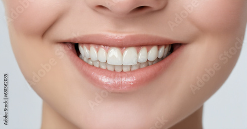 Obraz premium a close up photo of the lower part of a female face. beautiful cute smile with very clean perfect teeth. dental service advertisement concept