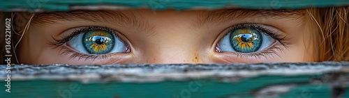 Fototapeta premium A close up photograph features beautiful blue eyes peering through the slats