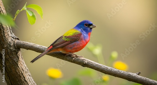 © Dear.Yun, Fototapeta premium A close-up photograph of a Painted Bunting perched on a small tree branch.