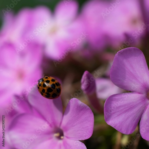 Fototapeta premium A close-up photograph of a vibrant ladybug with black spots perched on a delicate pink phlox flower, creating a beautiful scene of nature's harmony