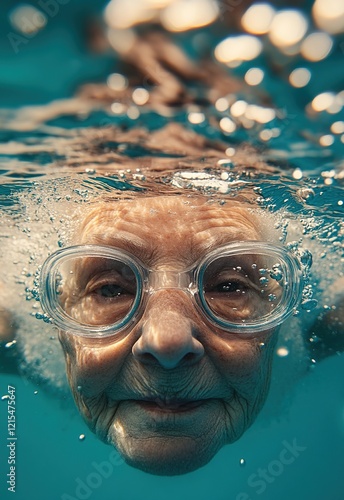 © ma, Fototapeta premium A close-up photograph of an elderly woman swimming in a pool.