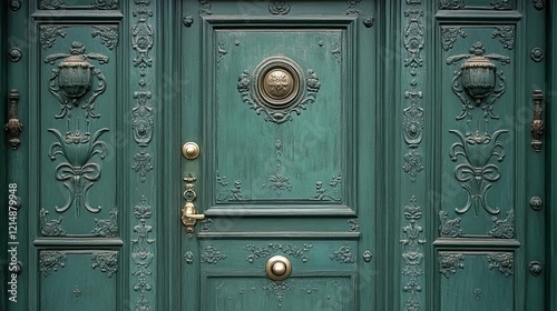 © KarpenArt Studio, Fototapeta premium A close-up photograph of an intricately carved and ornate green door with multiple brass doorknobs.