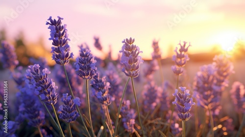 Naklejka premium A close-up photorealistic view of lavender blossoms swaying gently in the evening breeze, their delicate petals illuminated by the golden rays of the setting sun.