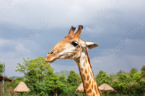 © Chaksin, Fototapeta premium A close-up picture of a giraffe on the farm. There are tourists to feed and are about to come and eat carrots.
