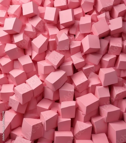 © Bualong, Obraz premium A close-up pile of pink foam blocks, varying in size and shape, creating a visually appealing and textured pattern