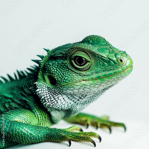 © Alex, Fototapeta premium A close-up portrait of a beautiful green lizard showcasing intricate details.