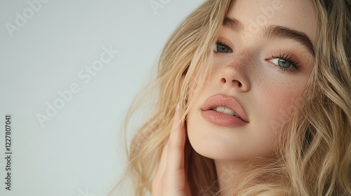 © ASA Creative, Fototapeta premium A close-up portrait of a beautiful young woman with blonde long hair gently touching her face, and a serene expression, showcasing natural beauty and elegance and tranquility, professional studio port