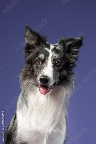 © Anna Averianova, Fototapeta premium A close-up portrait of a Border Collie with its tongue slightly sticking out, set against a deep purple background. The playful expression makes the dog look happy and friendly.