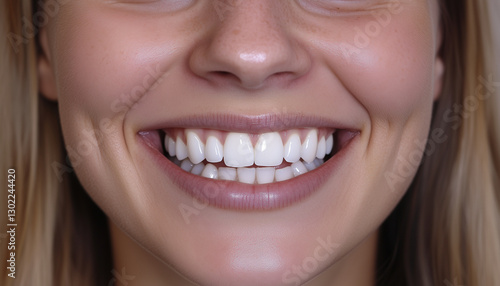 © Thongthawee, Obraz premium A close-up portrait of a cheerful woman with a bright smile, showcasing her healthy teeth. This image radiates happiness and confidence, perfect for health-related topics.