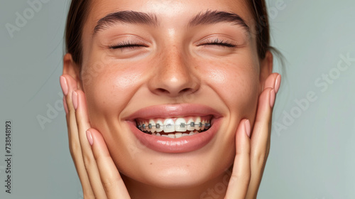 © Studio Nova, Obraz premium A close-up portrait of a cheerful young individual with braces on their teeth, displaying a happy and confident smile.